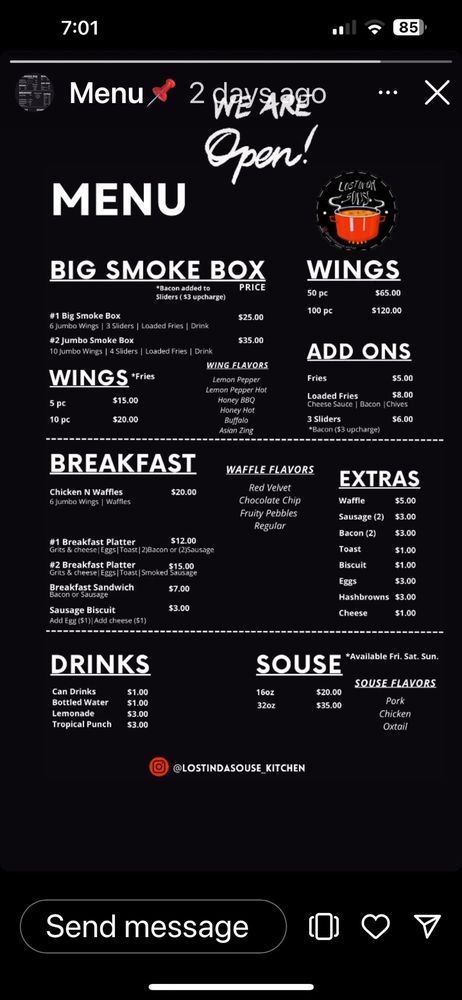 Introducing the menu at Lost In Da Souse Kitchen, a popular spot in Atlanta, GA 30331, known for its flavorful dishes. The restaurant offers a variety of options, including cheesy fries with a hint of spice, lemon pepper wings, and surprisingly large sliders. Customers have praised the red velvet waffles for their cake-like taste and the fruit punch for its sweetness. Despite a crowded atmosphere and lack of AC, the staff ensures orders are taken care of promptly. While some may find the sliders a bit sweet, the overall consensus is positive with a rating of 8/10. Don't miss out on the satisfying portions and amazing flavors offered at Lost In Da Souse Kitchen – a must-try for food enthusiasts in the area.